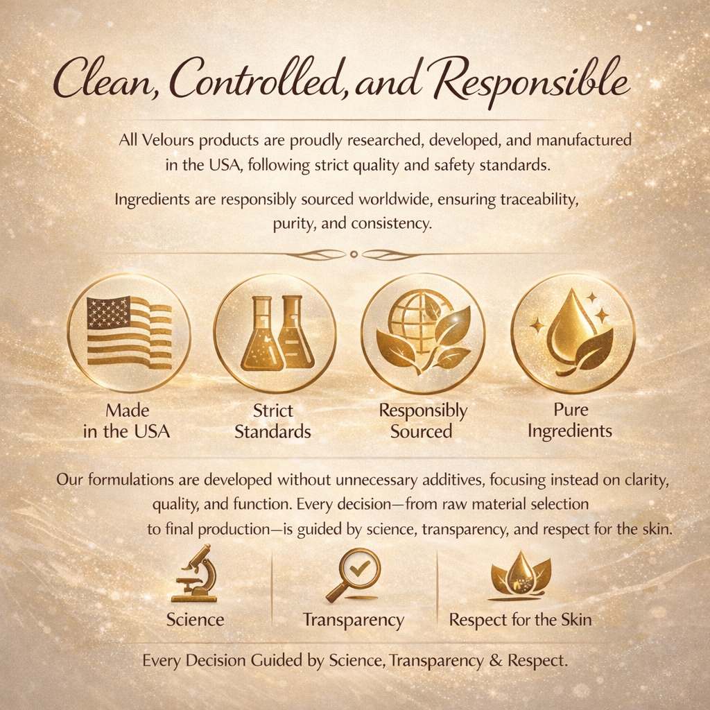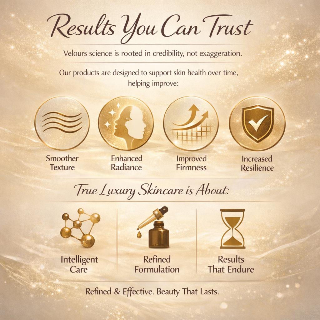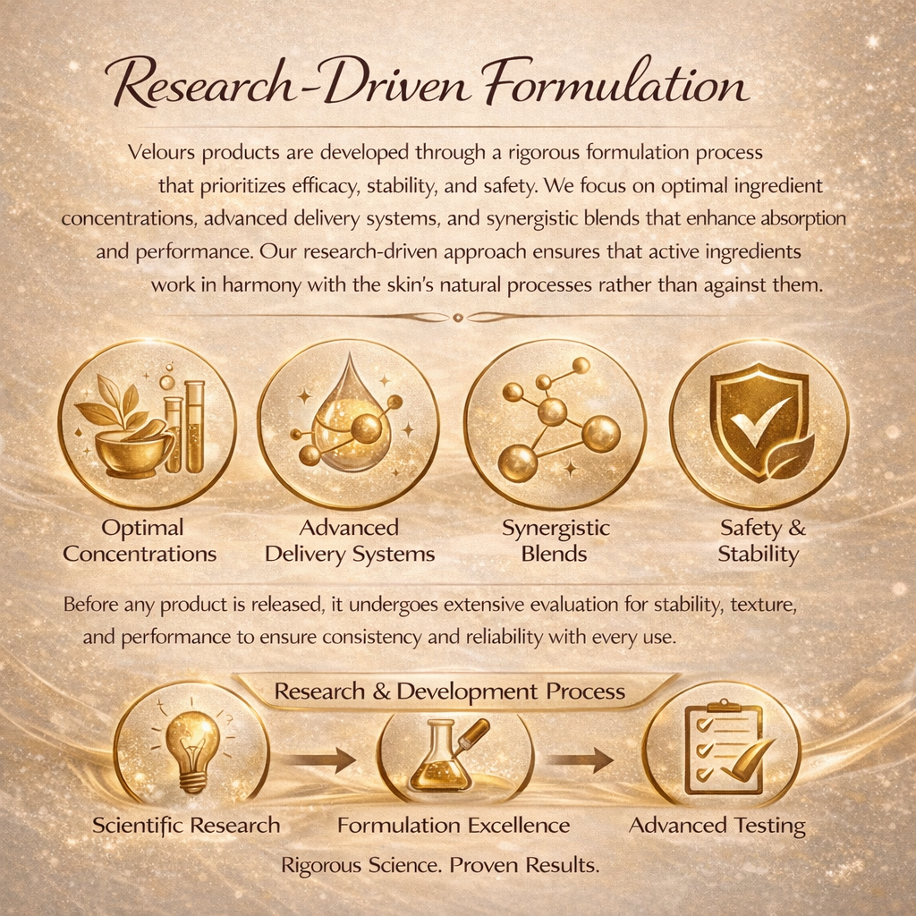 At Velours, science is not a trend—it is the foundation of everything we create. Every formula begins with research, precision, and a deep understanding of how skin functions at a cellular level. Our approach blends advanced cosmetic science with refined sensorial design, ensuring products that deliver visible results while maintaining the elegance and comfort of luxury skincare.